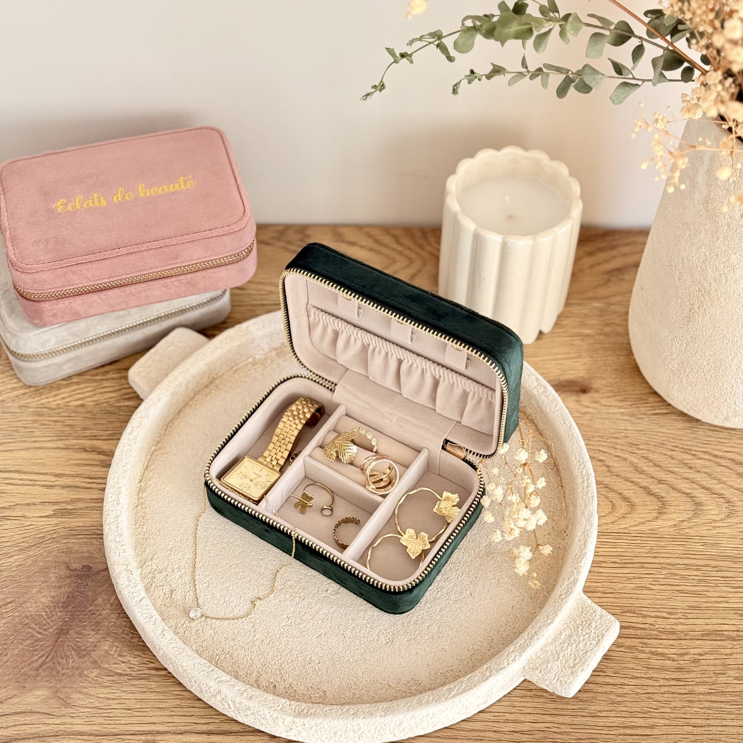 Pensée dans les moindres détails, cette boîte à bijoux en velours accueille avec soin vos bagues, colliers, montres, bracelets et boucles d’oreilles.