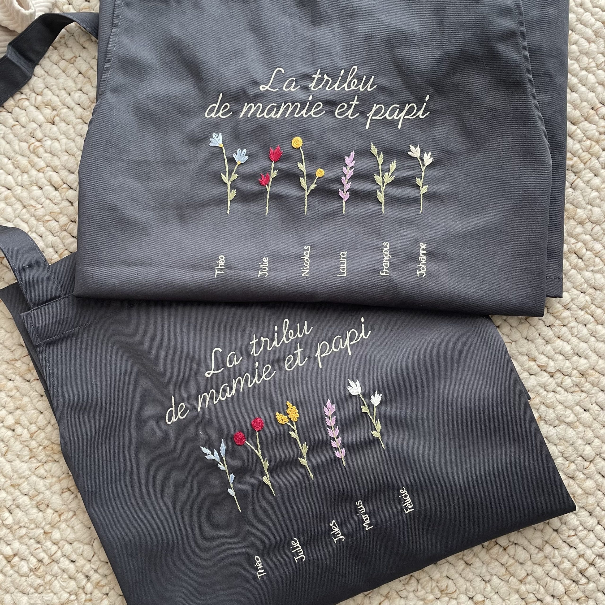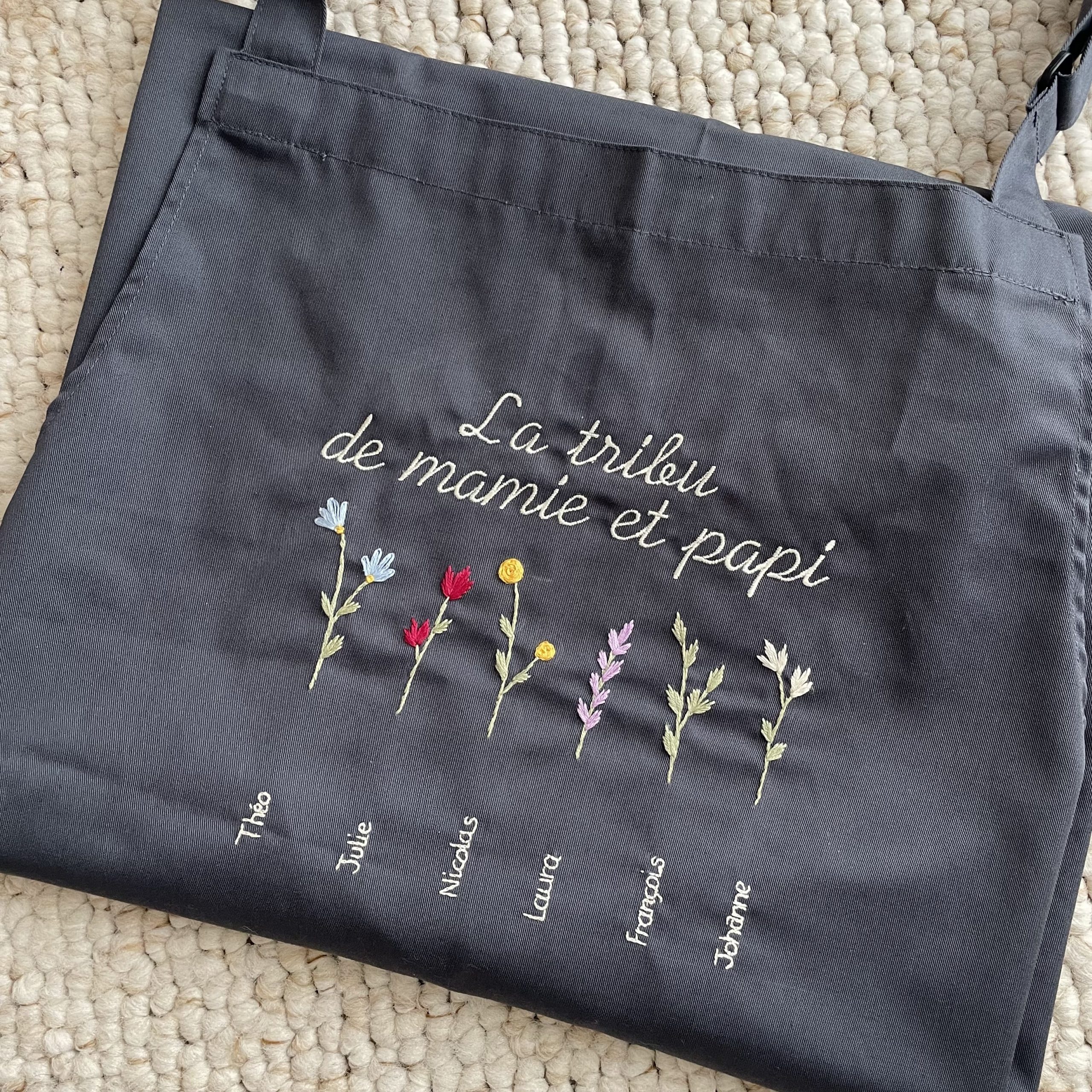 Offrez à votre grand-mère, un cadeau rempli d’amour avec ce tablier de cuisine pour mamie entièrement personnalisable. Brodé avec les prénoms de ses petits-enfants et décoré de fleurs symboliques, ce tablier allie émotion, utilité et élégance.  Ce cadeau personnalisé est idéal pour un anniversaire, la fête des grands-mères, noël ou simplement pour lui dire « je t’aime ». Un accessoire pratique, unique et chargé de sens, qui fera fondre le cœur de toutes les mamies.✨👵